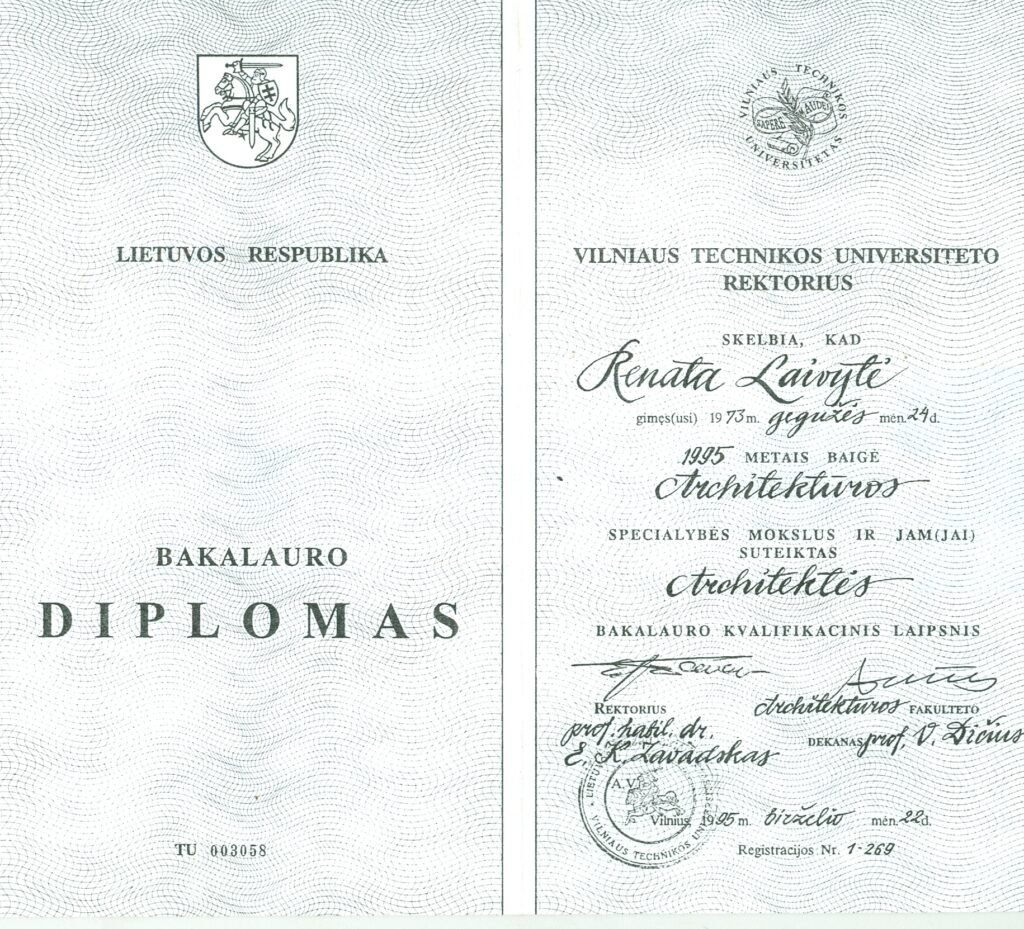 Bakalauro baigiamojo darbo (1998) pagrindinė idėja buvo ta, kad Juozas Laivys baigia visas VDA katedras ir kiekvienai katedrai padaro po atskirą baigiamąjį kūrinį. Architektūros katedros baigimasis kūrinys buvo Vilniaus Gedimino technikos universitete 1995 metais Renatai Laivytei išduotas architektės diplomas. Dokumentas atšviestas ir įrėmintas kleopo draugijos kontekste traktuojamas kaip vienas pirmųjų  J. Laivio bandymų žaisti tapatybėmis. Šiš darbas laikytinas vėliau atsiradusių kūrinių prototipu: Tėvo foto, ir J. Laivys /Polis Gogenas.